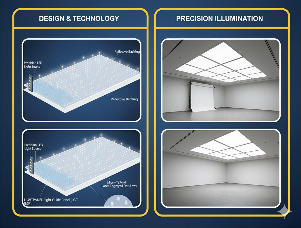 This engraved pattern serves as a road or channel, helping the LED light to evenly travel across the light guide panel. LED light panels are available in a multitude of colors including White, RGB, and Tunable White.